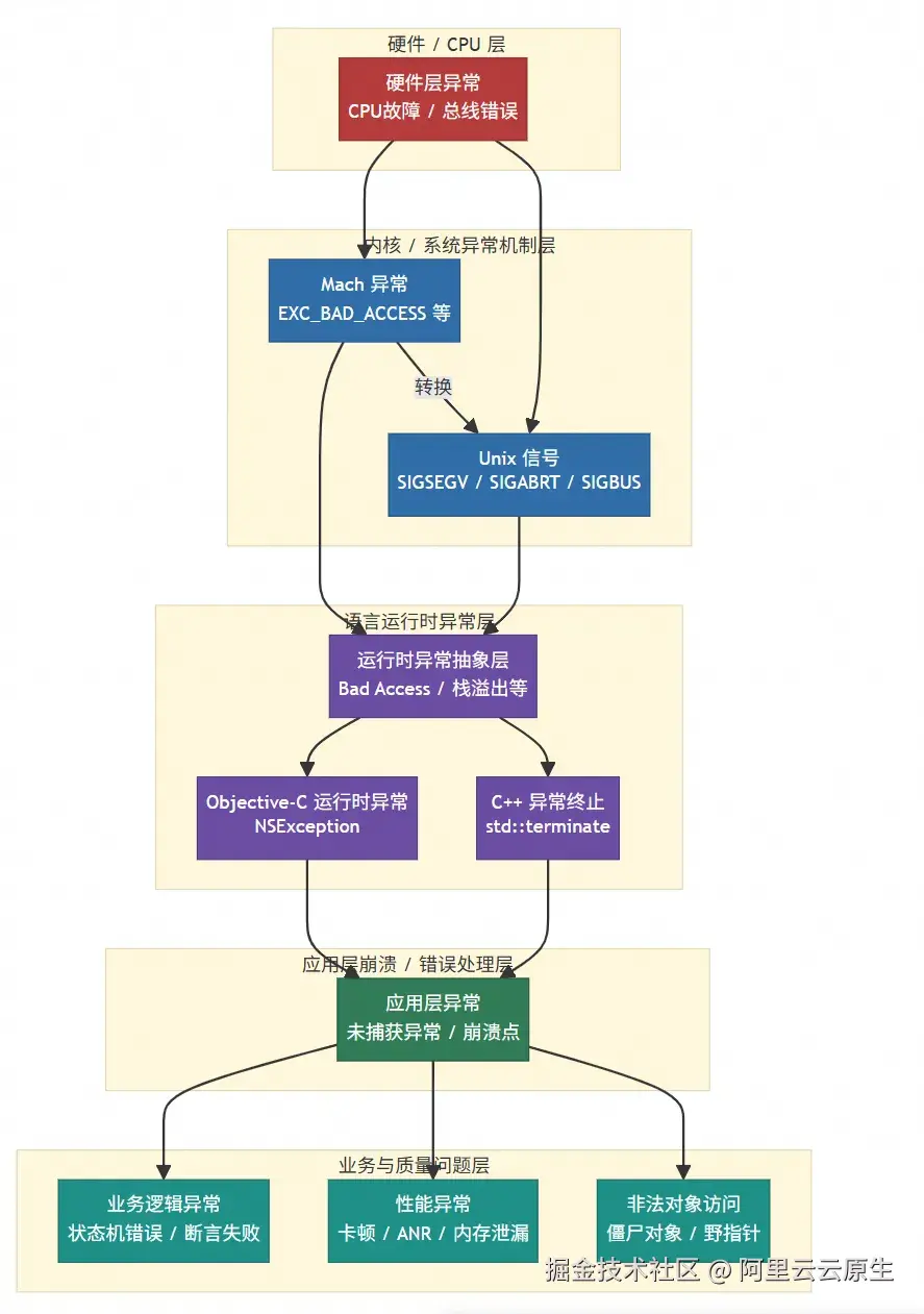 iOS 异常体系采用分层架构,从底层硬件到上层应用,异常在不同层次被捕获和处理。理解异常体系的分层结构,有助于我们更好地设计和实现异常监控方案。iOS 异常体系主要分为以下几个层次: