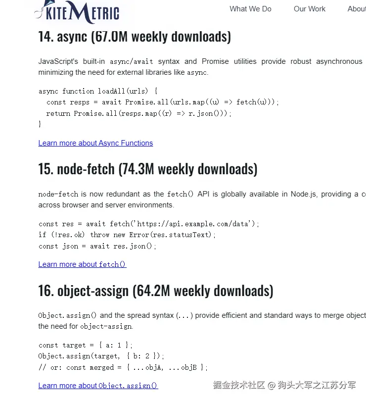 举个我亲身经历的例子:我维护过一个大型前端项目(React + Node 服务端渲染),package.json 里有近 70 个依赖。深究之后发现,其中 30% 的包其实是"只用了其中一个函数"或者"早就有原生 API 可替代"的,比如用于深拷贝的 lodash、处理日期的 moment、处理 URL 参数的 qs。而这三者都可以用现代 JavaScript 自带的语法或 API 实现,或者替换成更轻量的库,也能显著减小打包体积、提高启动速度。