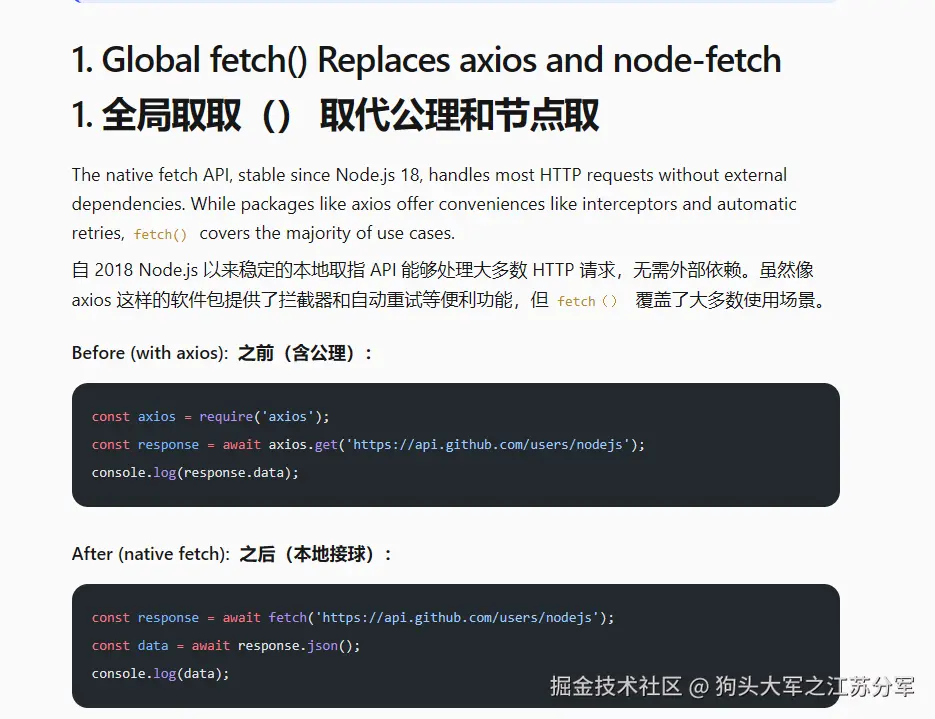 前几年我们搞请求就装 axios、搞日期就装 moment、深拷贝装 lodash、UUID 装 uuid、WebSocket 装 ws,反正遇到点儿啥先去包管理器搜一圈。结果现在你打开 Node.js 官方文档一看,Node 自己就带了好多以前靠包才能搞定的功能:原生 fetch() 现在可以替代 axios,crypto.randomUUID() 可以替代 uuid,而 fs/promises 的 glob() 可以替代 glob 包了。甚至 Node 从 18 版本开始就把浏览器里的 fetch() API 作为全局函数支持了,这意味着你 根本不需要外部的 HTTP 请求库 来写大多数网络请求代码了。