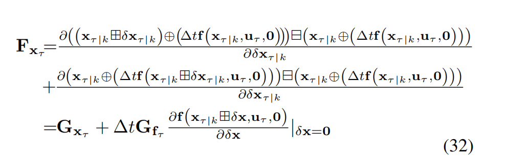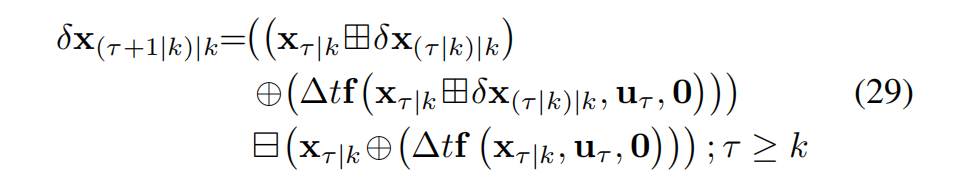 δ x τ + 1 ∣ k = x τ + 1 ⊟ x τ + 1 ∣ k = ( x τ ⊕ ( Δ t f ( x τ , u τ , w τ ) ) ) ⊟ ( x τ ∣ k ⊕ ( Δ t f ( x τ ∣ k , u τ , 0 ) ) ) (26) \delta x_{\tau+1|k} = x_{\tau+1} \boxminus x_{\tau+1|k} = \big(x_\tau \oplus (\Delta t f(x_\tau, u_\tau, w_\tau))\big)\\ \boxminus (x_{\tau|k}\oplus(\Delta t f({x_{\tau|k}}, u_\tau, 0)))\tag{26} δxτ+1∣k=xτ+1⊟xτ+1∣k=(xτ⊕(Δtf(xτ,uτ,wτ)))⊟(xτ∣k⊕(Δtf(xτ∣k,uτ,0)))(26)