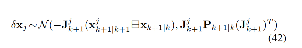 是 δ x k + 1 ∣ k \delta x_{k+1|k} δxk+1∣k 对 δ x j \delta x_j δxj 在零点处的雅可比逆矩阵。然后, δ x j \delta x_j δxj 的等效先验分布为: