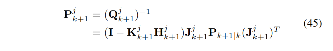 其中 Q k + 1 j Q^j_{k+1} Qk+1j 是公式 (43) 的 Hessian 矩阵,其逆矩阵表示 δ x j − δ x j o \delta x_j - \delta x^o_j δxj−δxjo 的协方差矩阵,进一步可以写成如下形式 [35]: