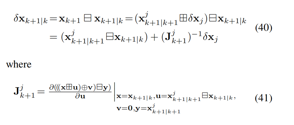 δ x k + 1 ∣ k + 1 = ( x k + 1 ∣ k + 1 κ ⊞ δ x κ ) ⊟ x k + 1 ∣ k + 1 κ = L k + 1 ( δ x κ − δ x κ o ) (49) \delta x_{k+1|k+1} = (x^{\kappa}{k+1|k+1} \boxplus \delta x^{\kappa}) \boxminus x^{\kappa}{k+1|k+1} \\= L_{k+1} (\delta x^{\kappa} - \delta x^o_{\kappa}) \tag{49} δxk+1∣k+1=(xk+1∣k+1κ⊞δxκ)⊟xk+1∣k+1κ=Lk+1(δxκ−δxκo)(49)