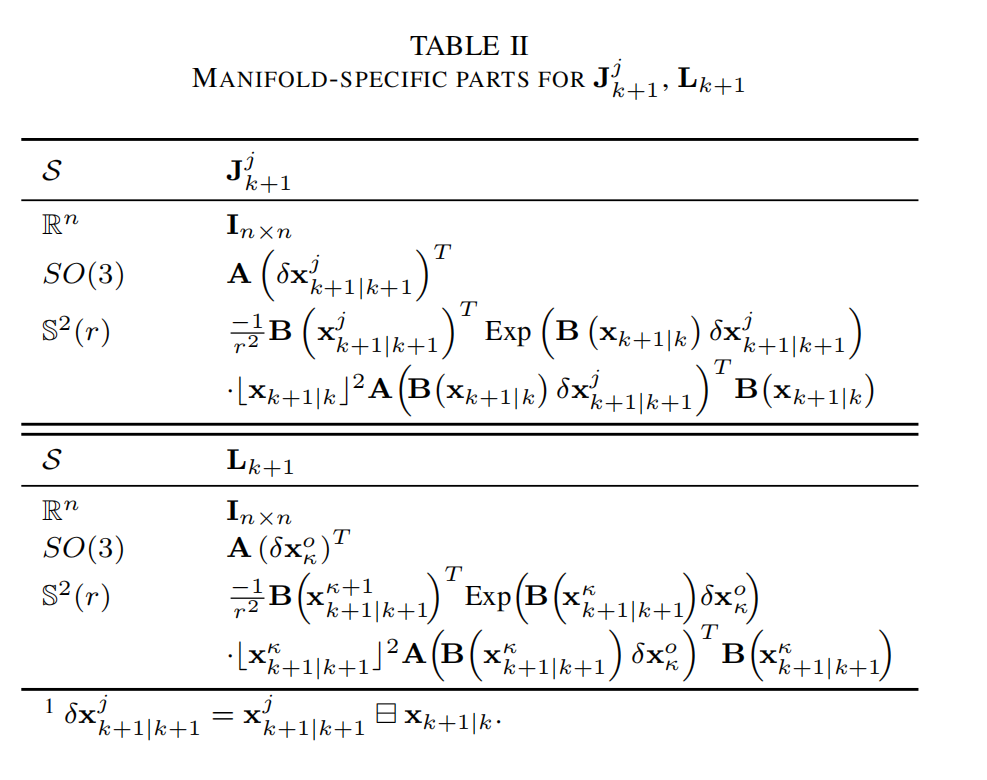 4. 流形结构的隔离 :注意,Kalman 更新中所需的两个矩阵 J k + 1 j J^j_{k+1} Jk+1j 和 L k + 1 L_{k+1} Lk+1 仅依赖于流形 S S S,因此它们是流形特定的矩阵。常用流形的取值总结如表 II 所示。同样,任何复合流形的流形特定部分都是这些原始流形的拼接。特别地,对于扩展 Kalman 滤波器(即 κ = 0 \kappa = 0 κ=0),有