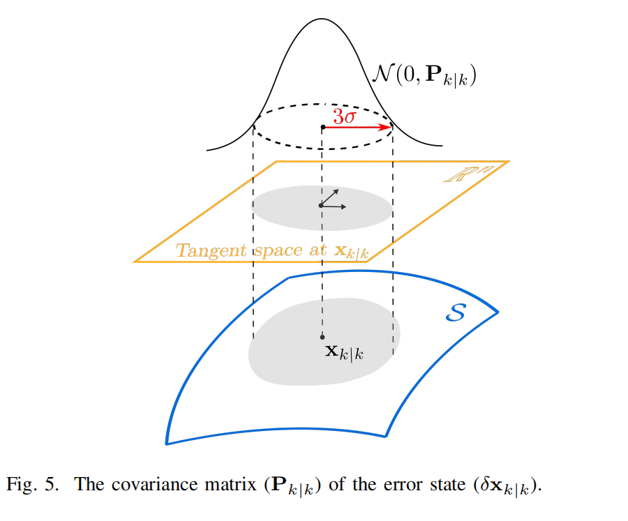 假设我们已收到到第 k k k 步的测量,并将该时刻的状态更新为 x k ∣ k x_{k|k} xk∣k,同时更新协方差矩阵为 P k ∣ k P_{k|k} Pk∣k。根据上述符号约定, P k ∣ k P_{k|k} Pk∣k 表示 δ x k ∣ k \delta x_{k|k} δxk∣k(状态更新 x k ∣ k x_{k|k} xk∣k 的切空间误差)的协方差矩阵。 δ x k ∣ k \delta x_{k|k} δxk∣k 与 P k ∣ k P_{k|k} Pk∣k 的关系如图 5 所示。