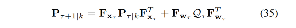 δ x τ + 1 ∣ k ≈ F x τ δ x τ ∣ k + F w τ w τ (31) \delta x_{\tau+1|k} \approx F_{x_\tau} \delta x_{\tau|k} + F_{w_\tau} w_\tau \tag{31} δxτ+1∣k≈Fxτδxτ∣k+Fwτwτ(31)