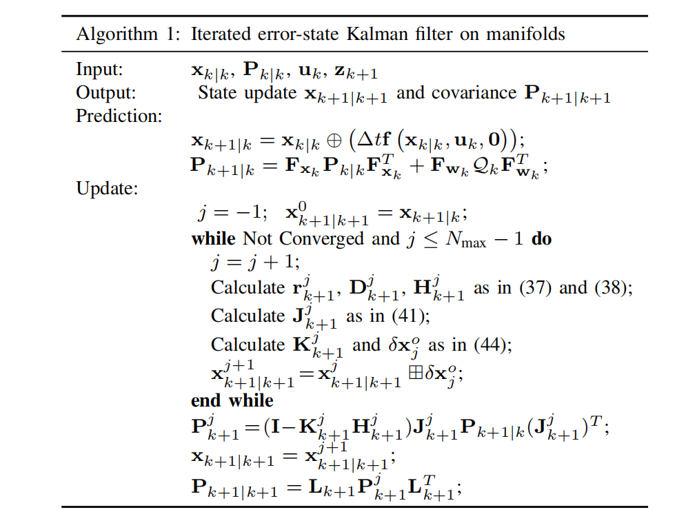 总结前面在第 V-A、V-B、V-C 和 V-D 节中介绍的所有步骤,可以得到在流形上运行的完整误差状态迭代 Kalman 滤波器(见算法 1)。将迭代次数 N max N_{\max} Nmax 设为零,则得到文献 [6,16] 中使用的误差状态扩展 Kalman 滤波器。