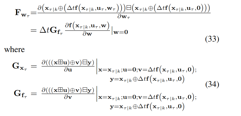 ∂ f ( x τ ∣ k ⊞ δ x , u τ , 0 ) ∂ δ x ∣ δ x = 0 , ∂ f ( x τ ∣ k , u τ , w ) ∂ w ∣ w = 0 . \frac{\partial f(x_{\tau|k} \boxplus \delta x, u_\tau, 0)}{\partial \delta x} \Big|{\delta x=0}, \quad \frac{\partial f(x_{\tau|k}, u_\tau, w)}{\partial w} \Big|_{w=0}. ∂δx∂f(xτ∣k⊞δx,uτ,0) δx=0,∂w∂f(xτ∣k,uτ,w) w=0.
