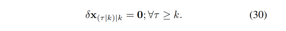 其中, F x τ F_{x_\tau} Fxτ 是在点 δ x ( τ ∣ k ) ∣ k = 0 \delta x(\tau|k)|k = 0 δx(τ∣k)∣k=0 处对 (27) 关于 δ x τ ∣ k \delta x_{\tau|k} δxτ∣k 的偏导数,具体为: