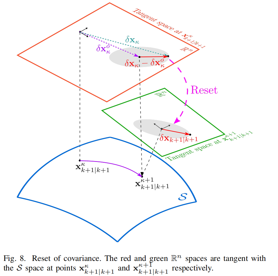 并传递到 Kalman 滤波器的下一步。对于 P k + 1 κ P^{\kappa}{k+1} Pk+1κ,注意它描述的是 δ x κ − δ x κ o \delta x^{\kappa} - \delta x^o{\kappa} δxκ−δxκo 的协方差,该协方差位于 x k + 1 ∣ k + 1 κ x^{\kappa}{k+1|k+1} xk+1∣k+1κ 的切空间中,而下一步 Kalman 滤波器需要的是描述 δ x k + 1 ∣ k + 1 \delta x{k+1|k+1} δxk+1∣k+1 的协方差 P k + 1 ∣ k + 1 P_{k+1|k+1} Pk+1∣k+1,其位于 x k + 1 ∣ k + 1 x_{k+1|k+1} xk+1∣k+1 的切空间中(见 V-A 节)。这种差异需要一个投影步骤,如图 8 所示。根据误差状态在 (25) 的定义,我们有: