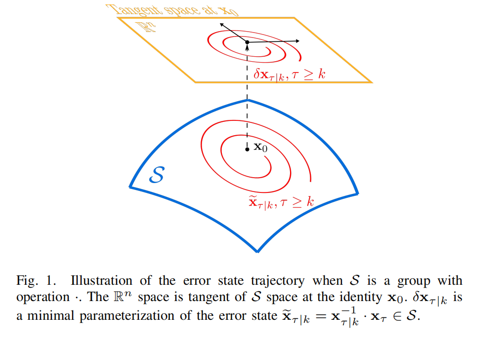 定义在原流形 S S S 上的误差状态为 x τ ∣ k e = x τ − 1 ⋅ x τ x^e_{\tau|k} = x_\tau^{-1} \cdot x_\tau xτ∣ke=xτ−1⋅xτ ,两个轨迹 δ x τ ∣ k \delta x_{\tau|k} δxτ∣k 与 x τ ∣ k e x^e_{\tau|k} xτ∣ke 之间的关系如图 1 所示。