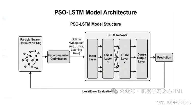 PSO-LSTM 模型是将 粒子群算法 (Particle Swarm Optimization, PSO) 与 长短期记忆网络 (Long Short-Term Memory, LSTM) 相结合的优化架构。