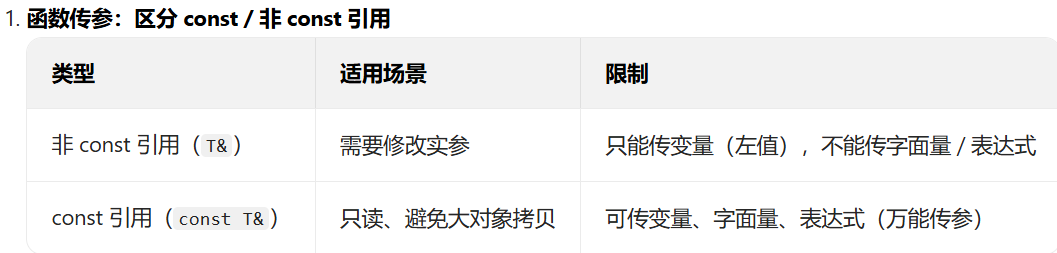 核心用途:只读访问实参、避免大对象拷贝(最常用!);