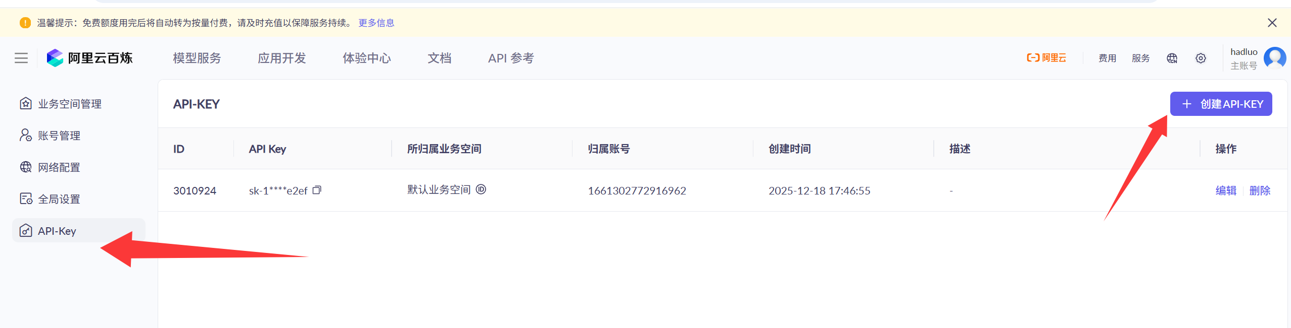 通义千问这边,很多人卡在"我到底该去哪儿建 Key"。官方文档的说法是: 开通百炼模型服务后,需要手动创建 API Key ,入口在"密钥管理"的 API-Key 页签。