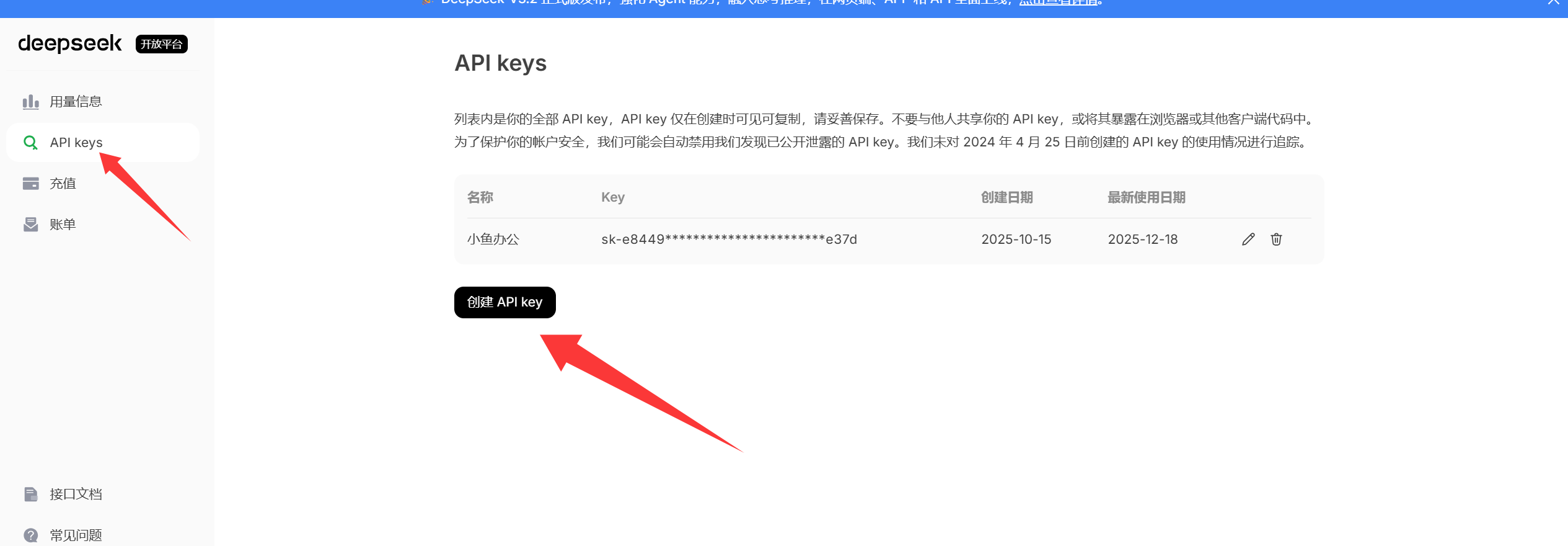 我个人对 DeepSeek 的印象是:文档说话很直接------ 先创建 API key ,再照 OpenAI 兼容格式去调就行。
