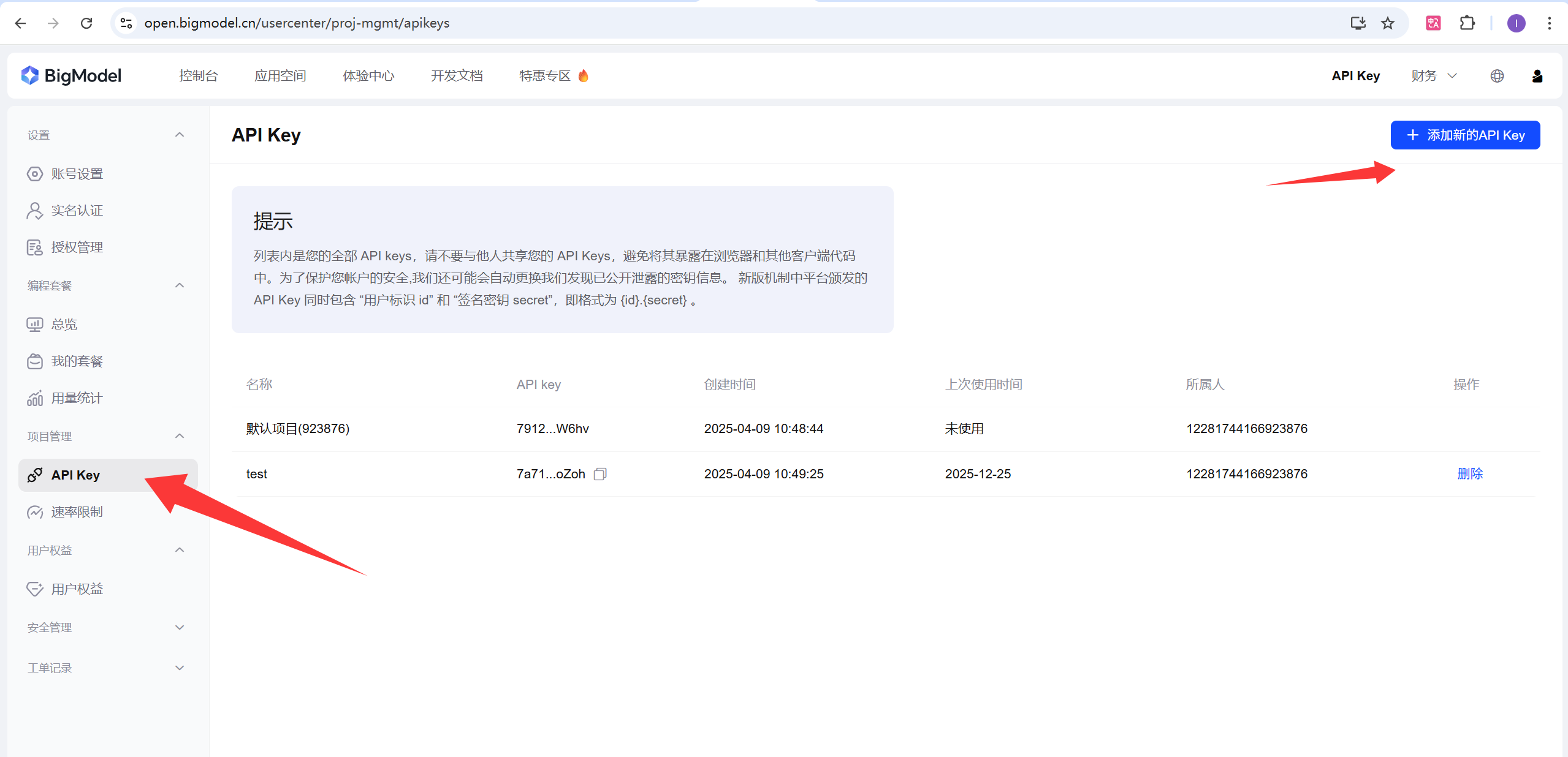 智谱的 Key 通常在用户中心里管理:登录后进入 API Keys 页面创建即可。
