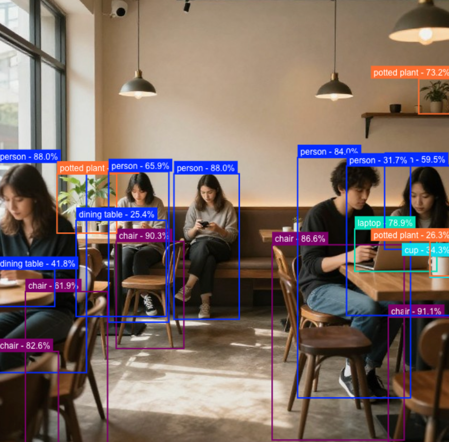 在室内多人、多物体的环境中,YOLO11 不只"看见"物体,还能把每个人、每张桌椅从背景中清晰分离出来,准确区分彼此边界。