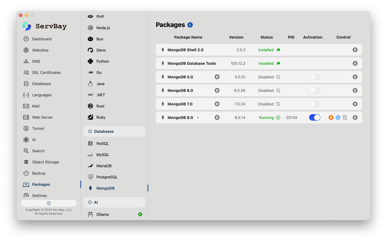 但这些问题在ServBay面前都是小Case,因为ServBay 能够极大简化这一流程。它不仅支持一键安装 MongoDB,更解决了多版本共存的痛点。