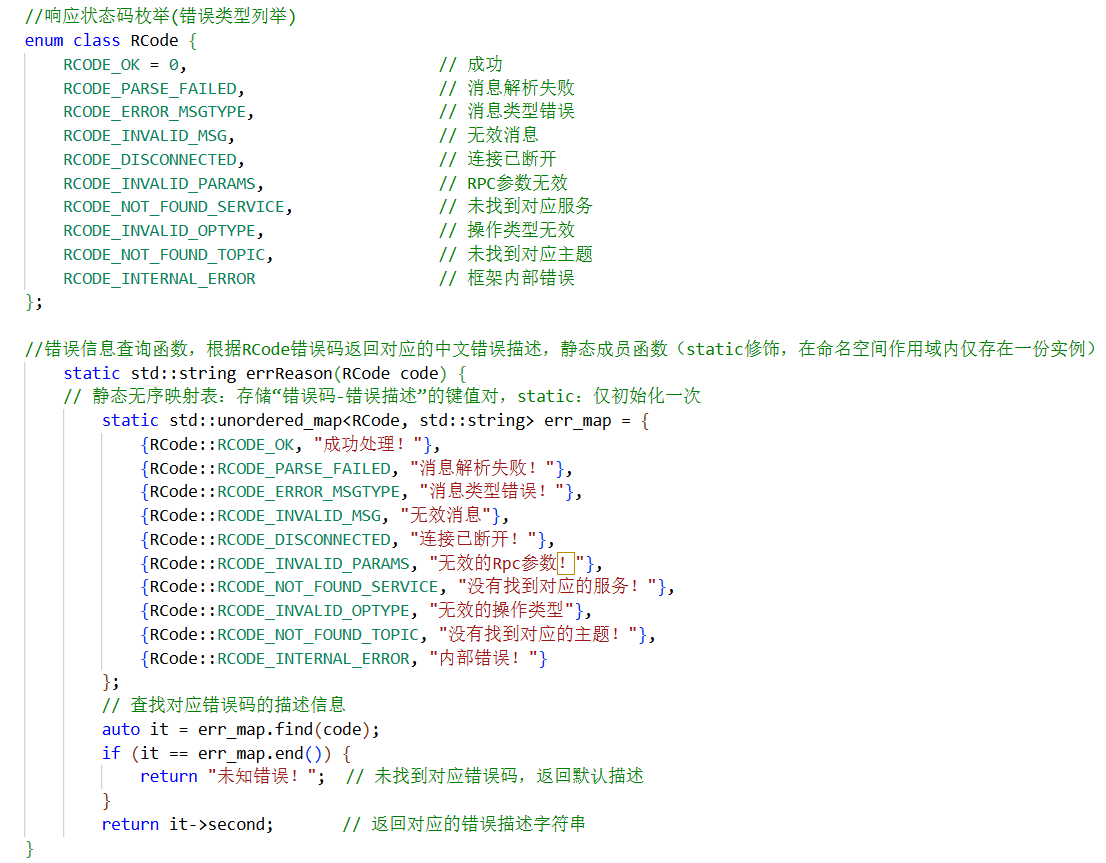 - 大量使用强类型枚举提升代码安全性 ,使用宏定义统一常量,使用无序映射实现高效错误查询,体现了良好的 C++ 编码规范。