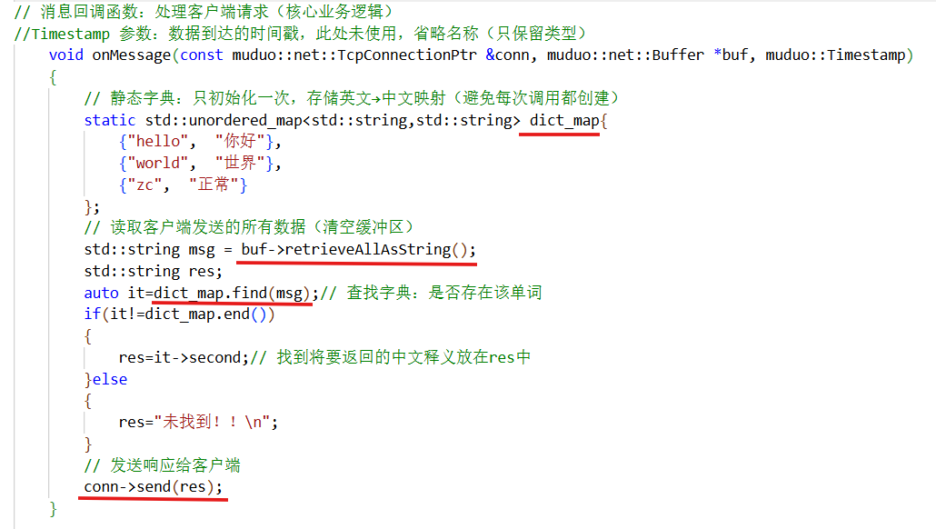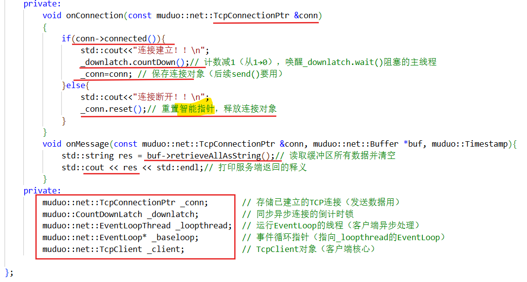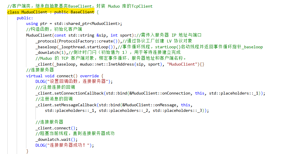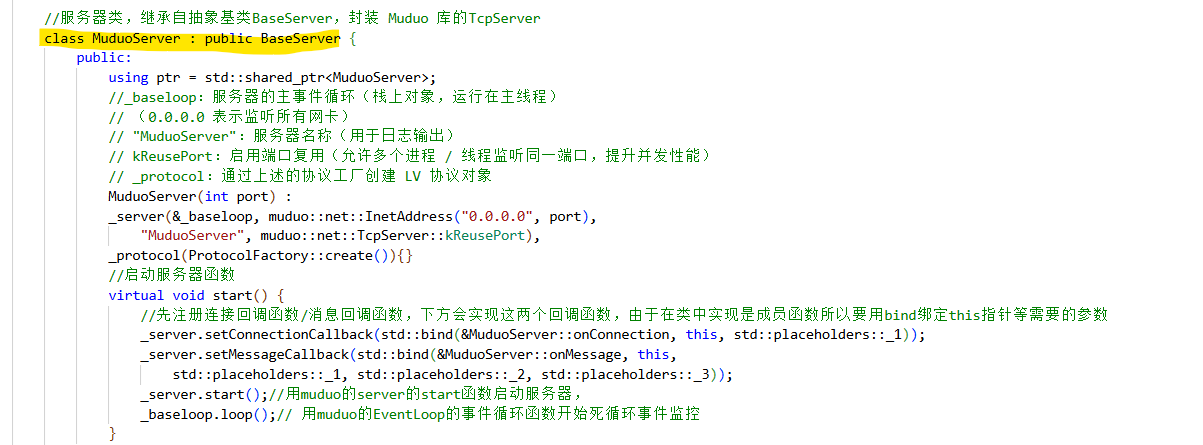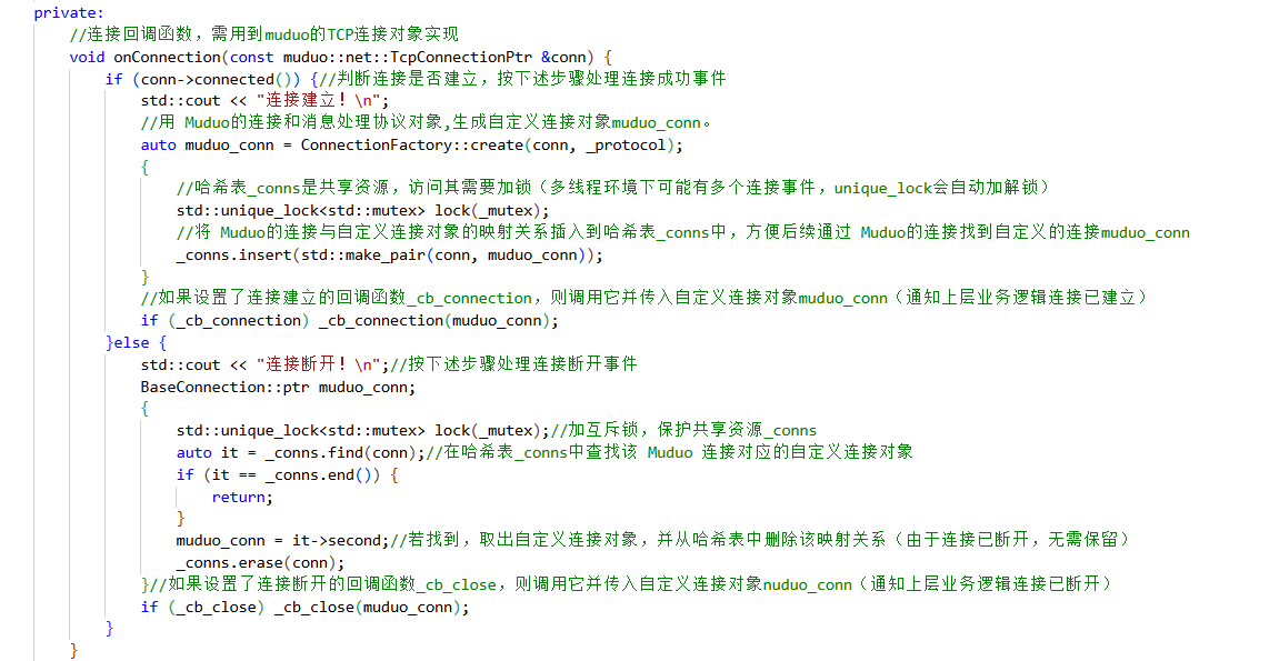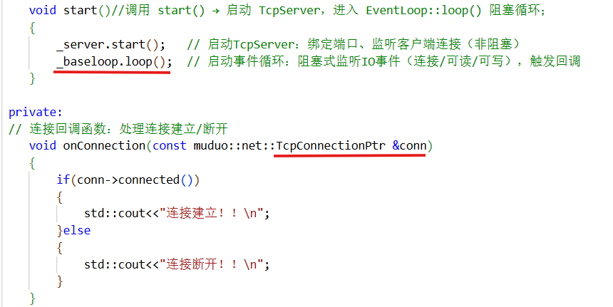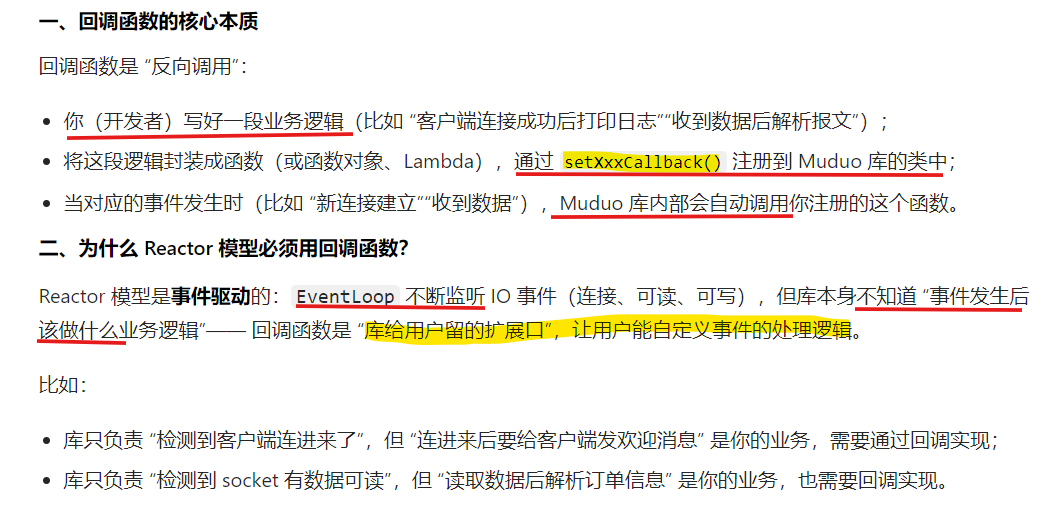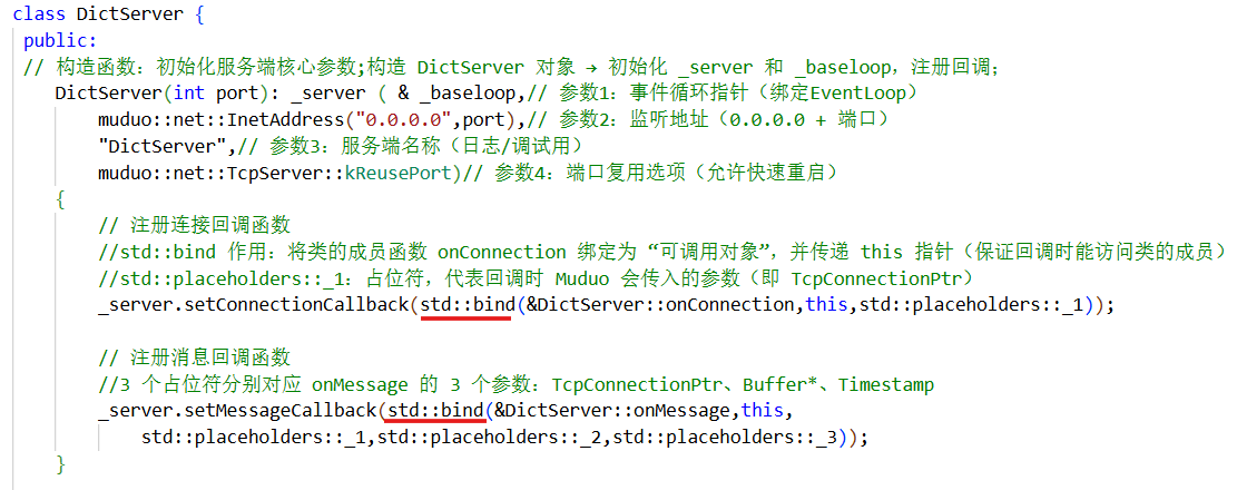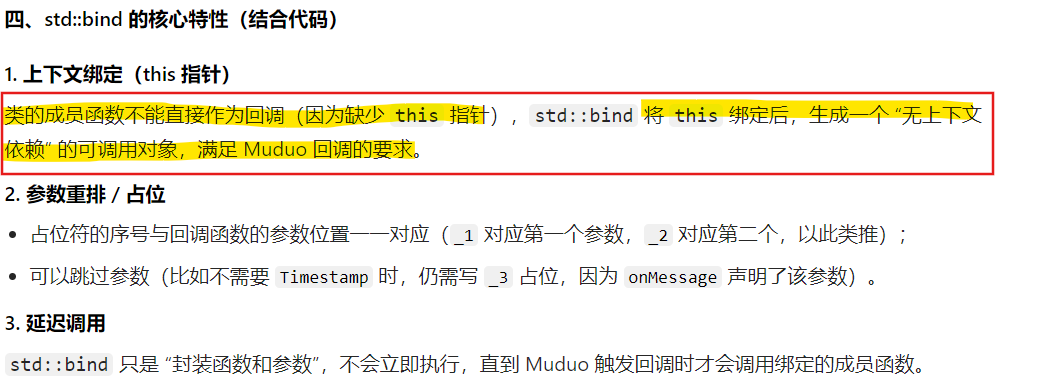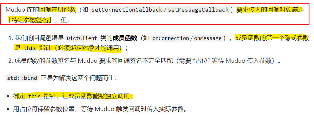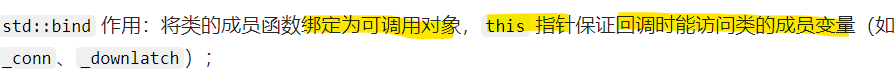std::bind 是 "适配器",让你的成员函数能适配 Muduo 库的回调接口,实现 "你定义逻辑,库触发调用" 的异步回调机制。