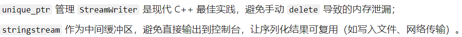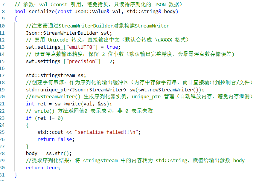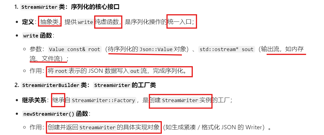 这些类是 Jsoncpp 提供的更灵活的序列化接口 ,可通过StreamWriterBuilder配置序列化格式(如缩进、空格),更适配复杂场景下的 RPC 数据封装。