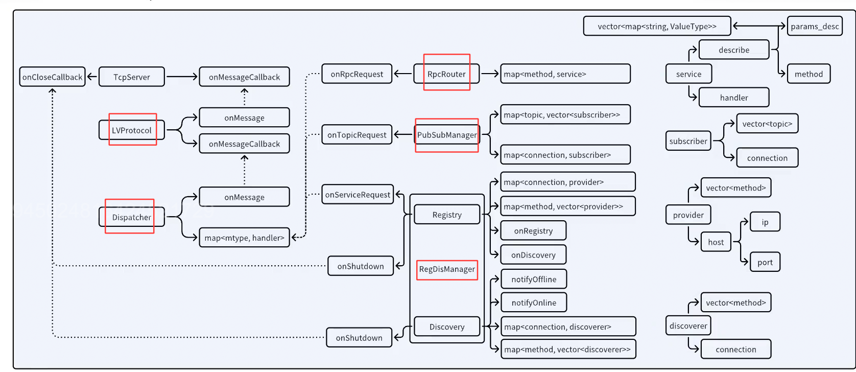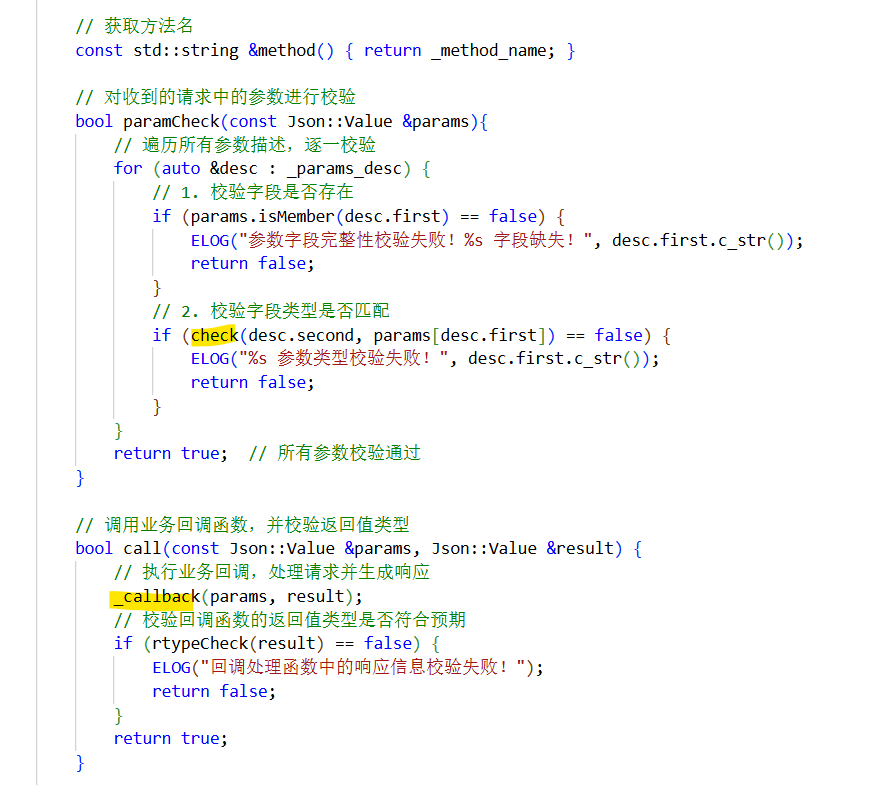 该模块包含一个 存储 "方法名 - 服务描述" 的映射的哈希表, 其中服务描述包含回调函数、方法名称、参数字段格式、参数校验接口等进行检验。