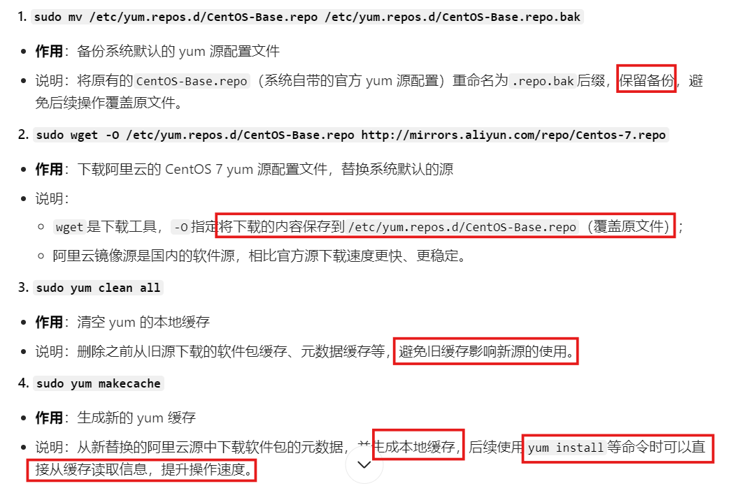 上述命令是CentOS 7 系统中替换 yum 软件源为阿里云镜像源的操作;