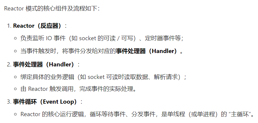 Reactor 模式是一种**事件驱动的并发编程模型,**核心是 "通过一个事件循环监听事件,再分发到对应的处理逻辑"