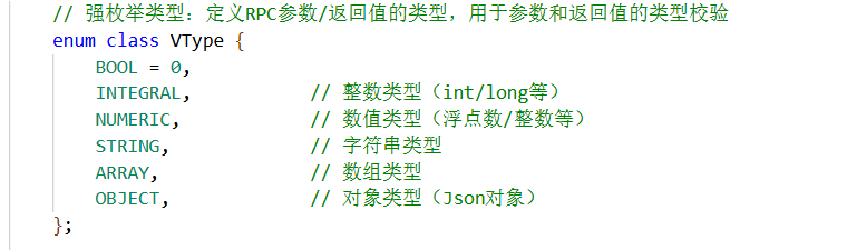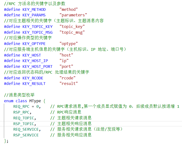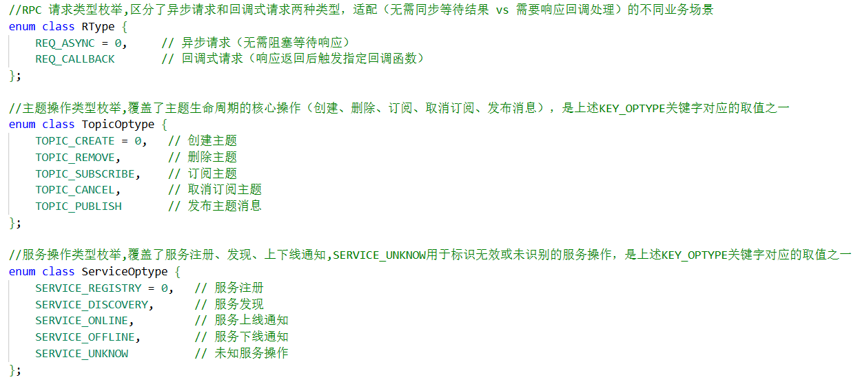 - 功能上覆盖了 RPC 通信的消息类型、状态码、请求类型、主题操作、服务操作 等核心维度,为后续的消息序列化、服务治理、主题通信提供了基础支撑。