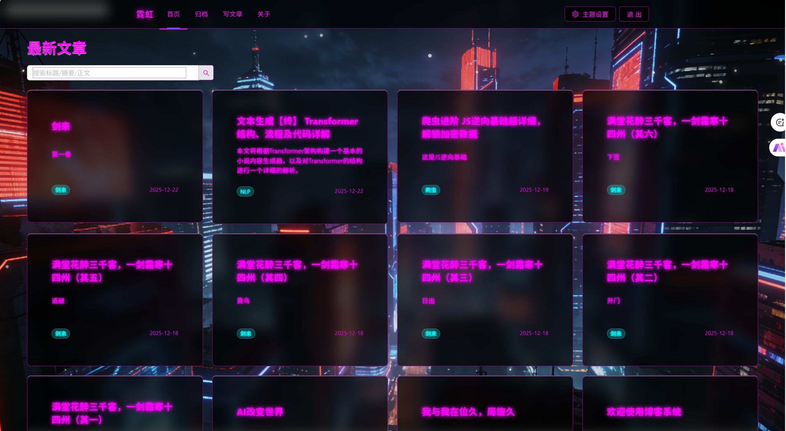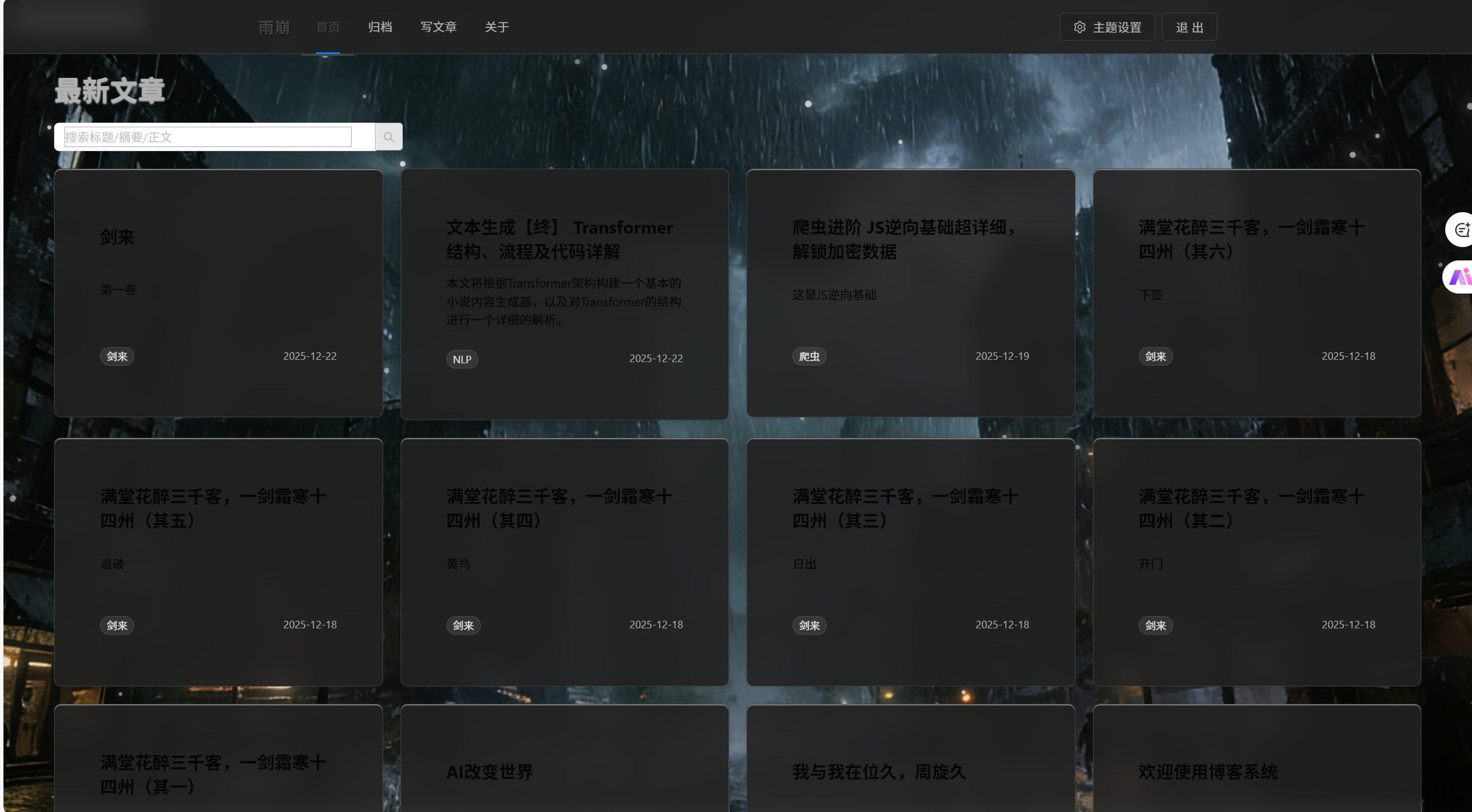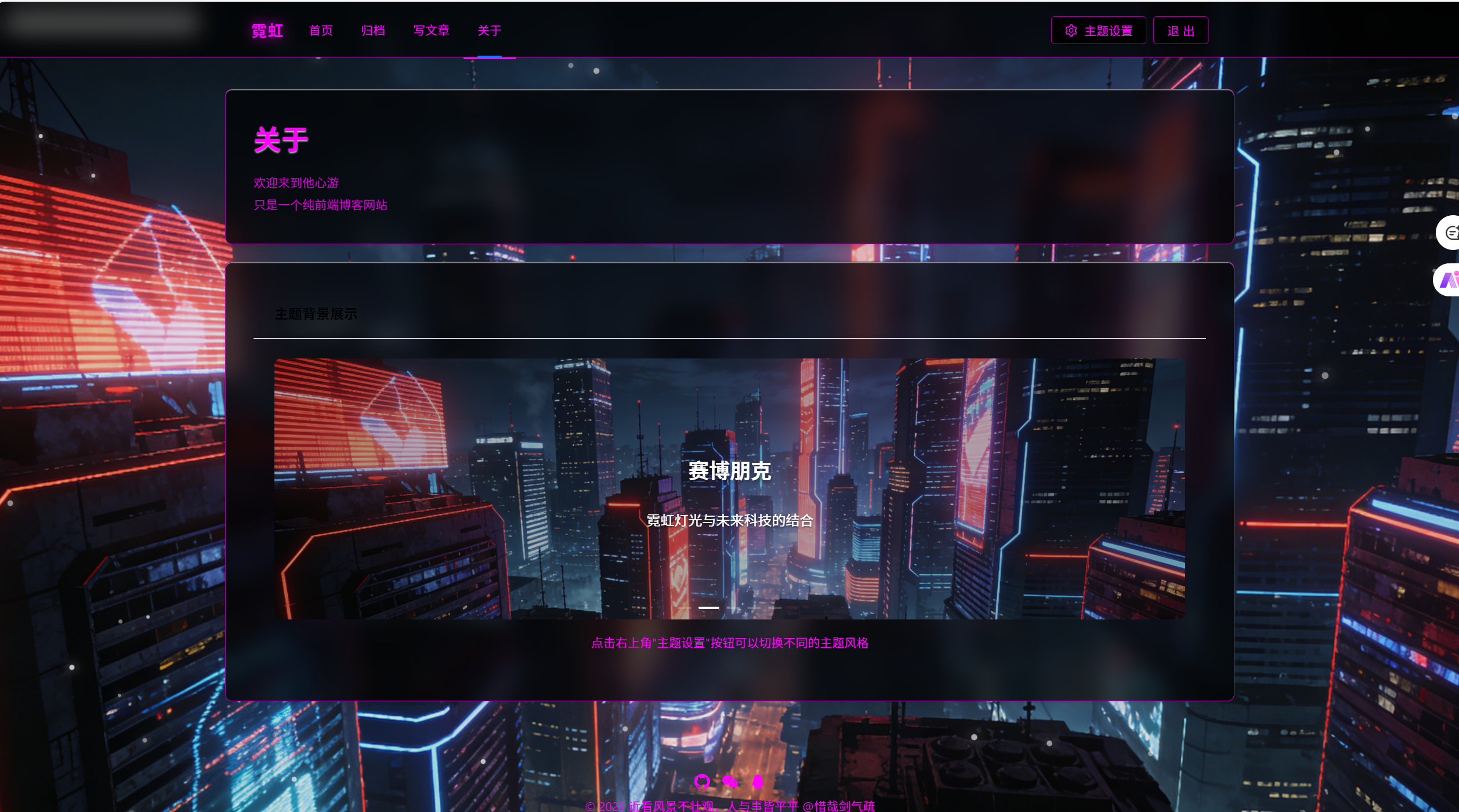 本项目使用了五个主题,分别是***【武侠水墨】、【赛博朋克】、【自然风光】、【泪如雨崩】、【这是我家】***。可以在右上角切换主题,改变观看体验: