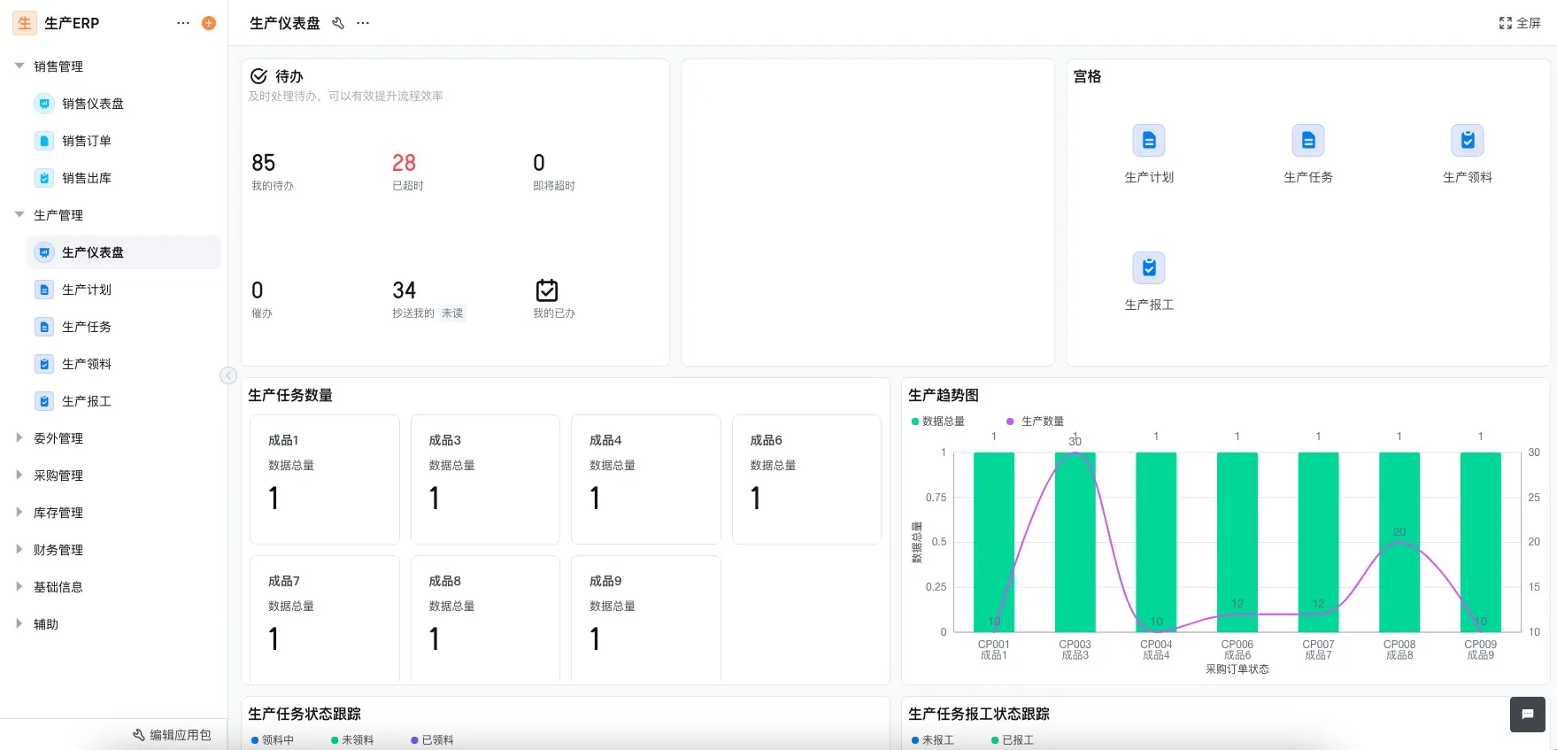 基于数字化BOM清单,系统实现从原材料采购、入库、领用,到半成品加工、成品入库的全链路管控。物料需求计划(MRP)模块结合生产计划与库存数据,自动生成采购订单与物料领用单,明确标注物料规格、数量、交付时间,确保"物料跟着生产走"。同时,通过批次管理与条码追溯功能,实现物料从采购到成品交付的全程可追溯,解决物料混用、流失等问题。