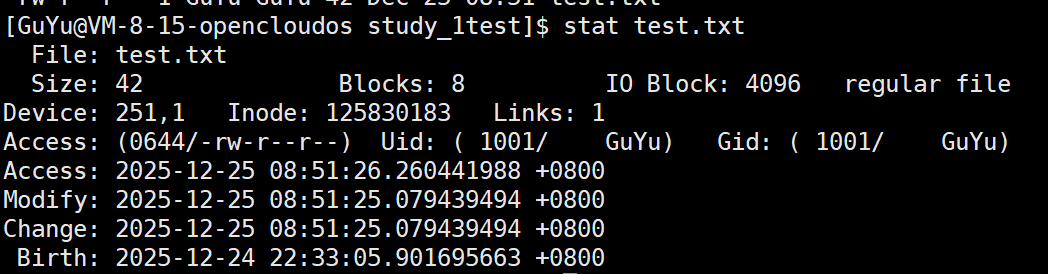Change Time (ctime):书的元信息发生了变化(比如你换了书的封面、改变了书的归属权,或者书本身的页数变了)。注意:修改内容也会导致元信息(如文件大小)变化,所以修改内容会同时更新 mtime 和 ctime