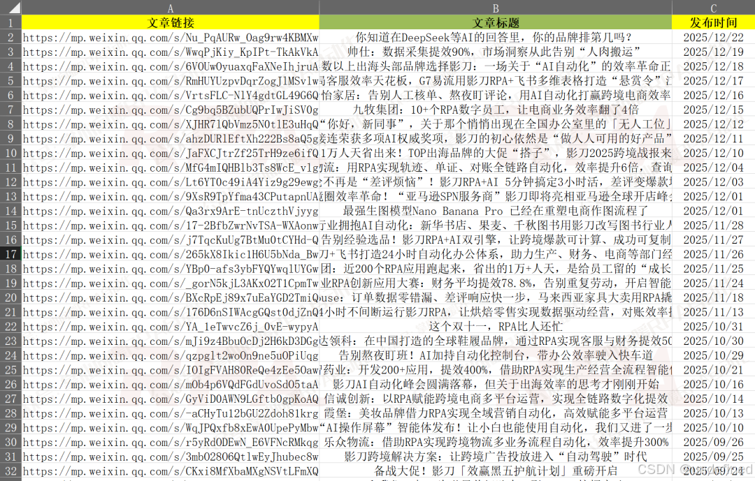 这里以采集"影刀RPA"官方公/仲/呺文章为例,具体运行效果如下: