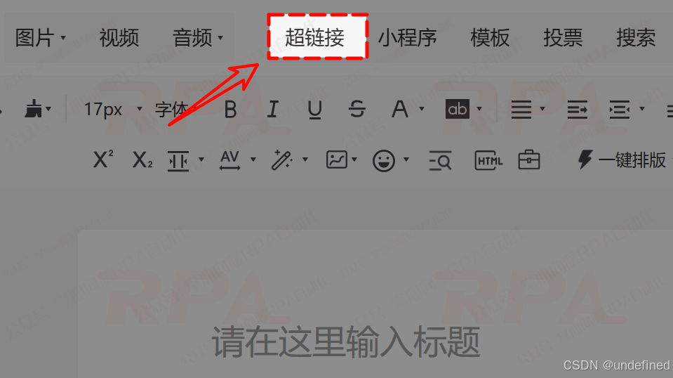 2)在打开的新网页中,找到并点击顶部工具导航栏的「超链接」。