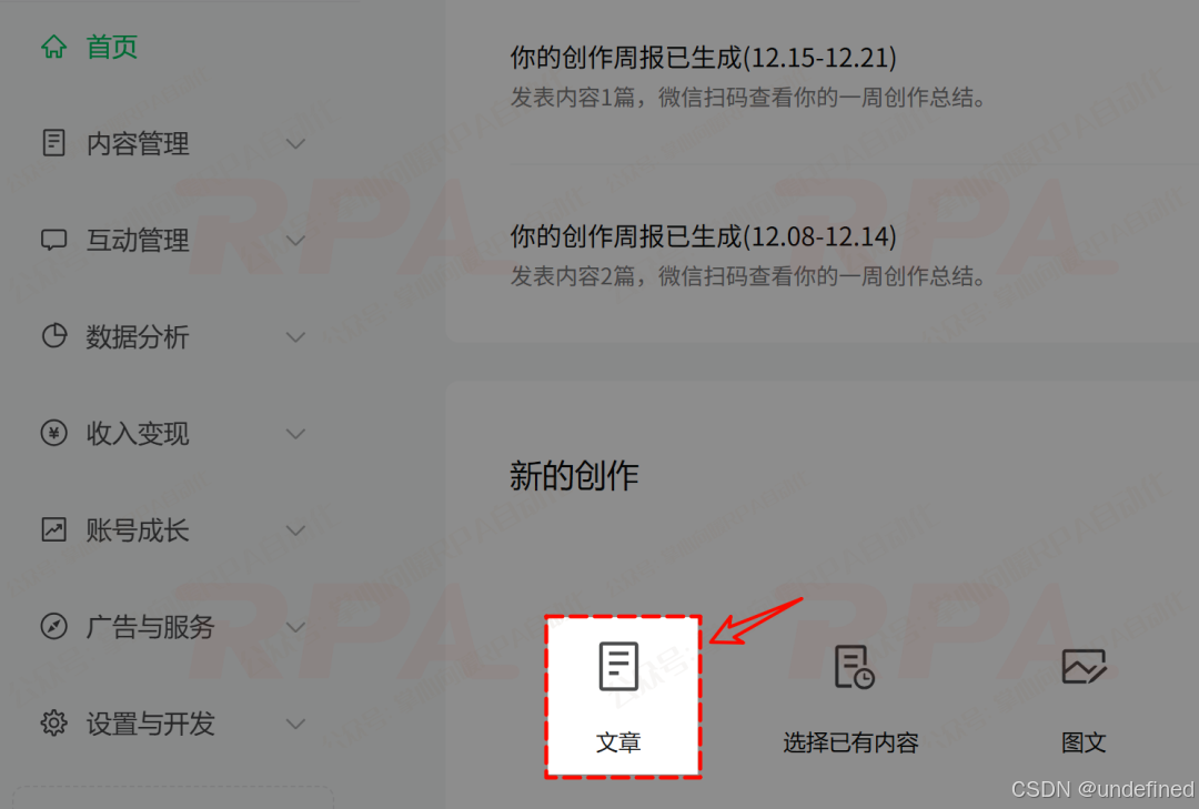 1)在"**公/仲/呺管理后台页面-新的创作"**下面找到并点击「文章」入口。