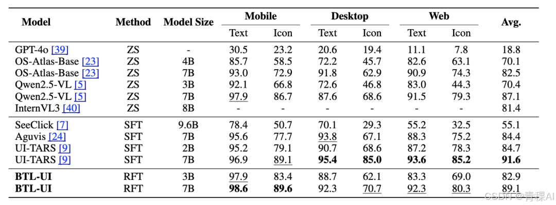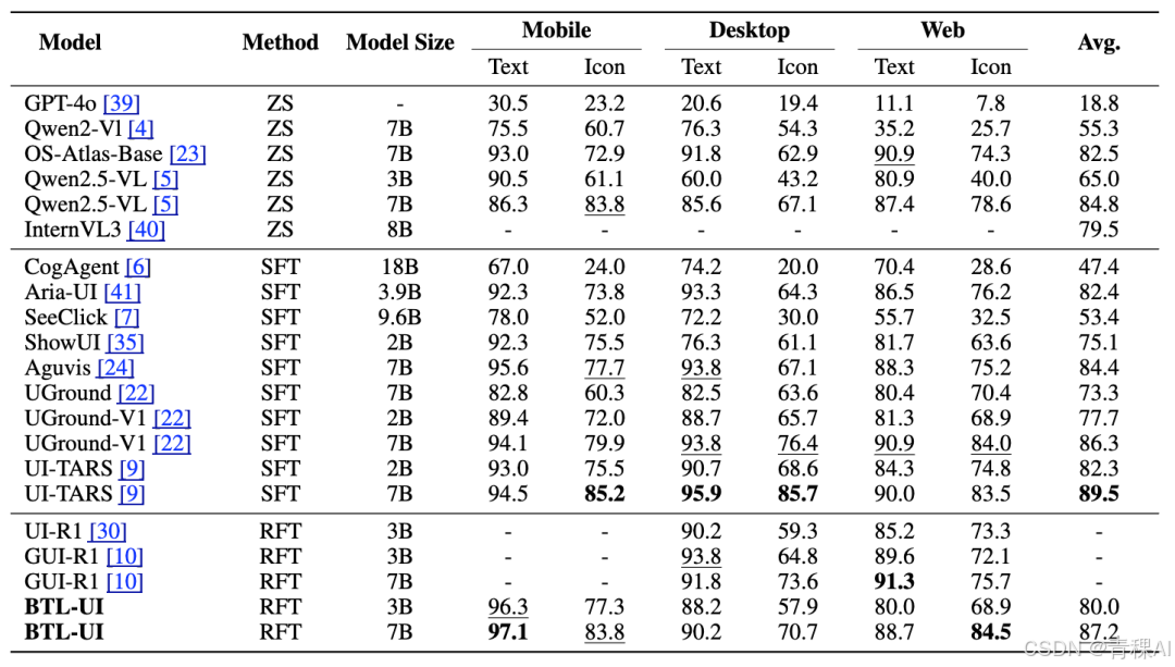 定位能力:在 ScreenSpot 数据集上,BTL-UI-7B 以 87.2% 的平均准确率超越基线,在 ScreenSpot-V2 上进一步提升至 89.1%;3B 版本亦取得强竞争力,验证训练范式有效性。