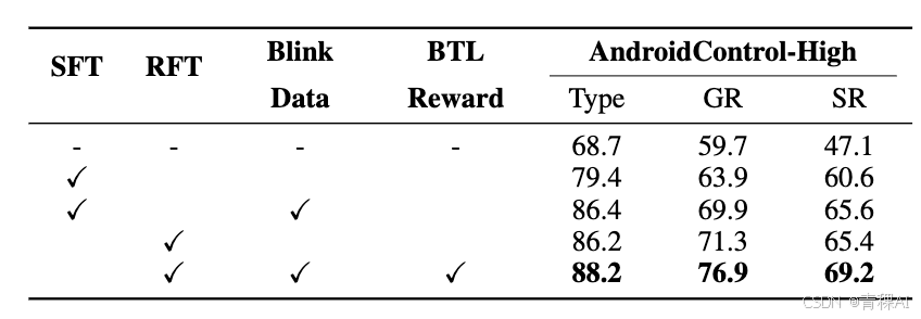 当仅使用监督微调训练时,BTL-UI的成功率为60.6%。进一步使用生成的眨眼数据后,监督微调的性能提升了5%,这证明眨眼数据不仅适用于强化微调,也适用于监督微调。