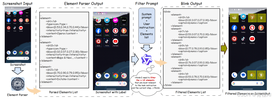 模型需要如同人类扫视眼动般,快速定位屏幕上的视觉焦点。为此,本文构建了眨眼数据(Blink Data)的自动化标注管线:首先提取按钮、图标、文本字段等单独 UI 元素,并为其标注边界框、类型与语义标题;随后调用 Qwen2.5-VL 32B,根据视觉显著性和任务相关性过滤、排序元素,以模拟自上而下的注意力。