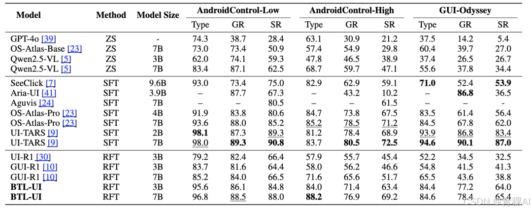 高级规划能力:在 AndroidControl-High 与 GUI-Odyssey 的长步骤任务中,BTL-UI-7B 分别取得 69.2% 与 65.4% 的步骤成功率,领先其他基于强化微调的模型。