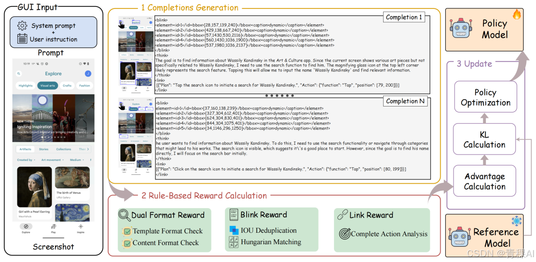 因此,本文采用严格的二元标准:仅当动作类型及其关联参数完全正确时,智能体才能获得奖励。这种全有或全无的机制确保最终生成的指令具有内部一致性,并能准确反映预期GUI操作。