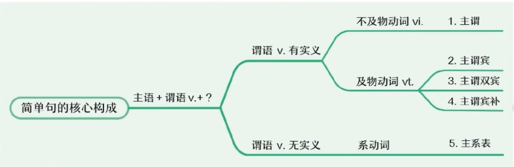谓语动词是简单句的核心,其类型决定了简单句的结构。故简单句可再细分为五类不同的核心构成:主谓、主谓宾、主谓双宾、主谓宾补、主系表。