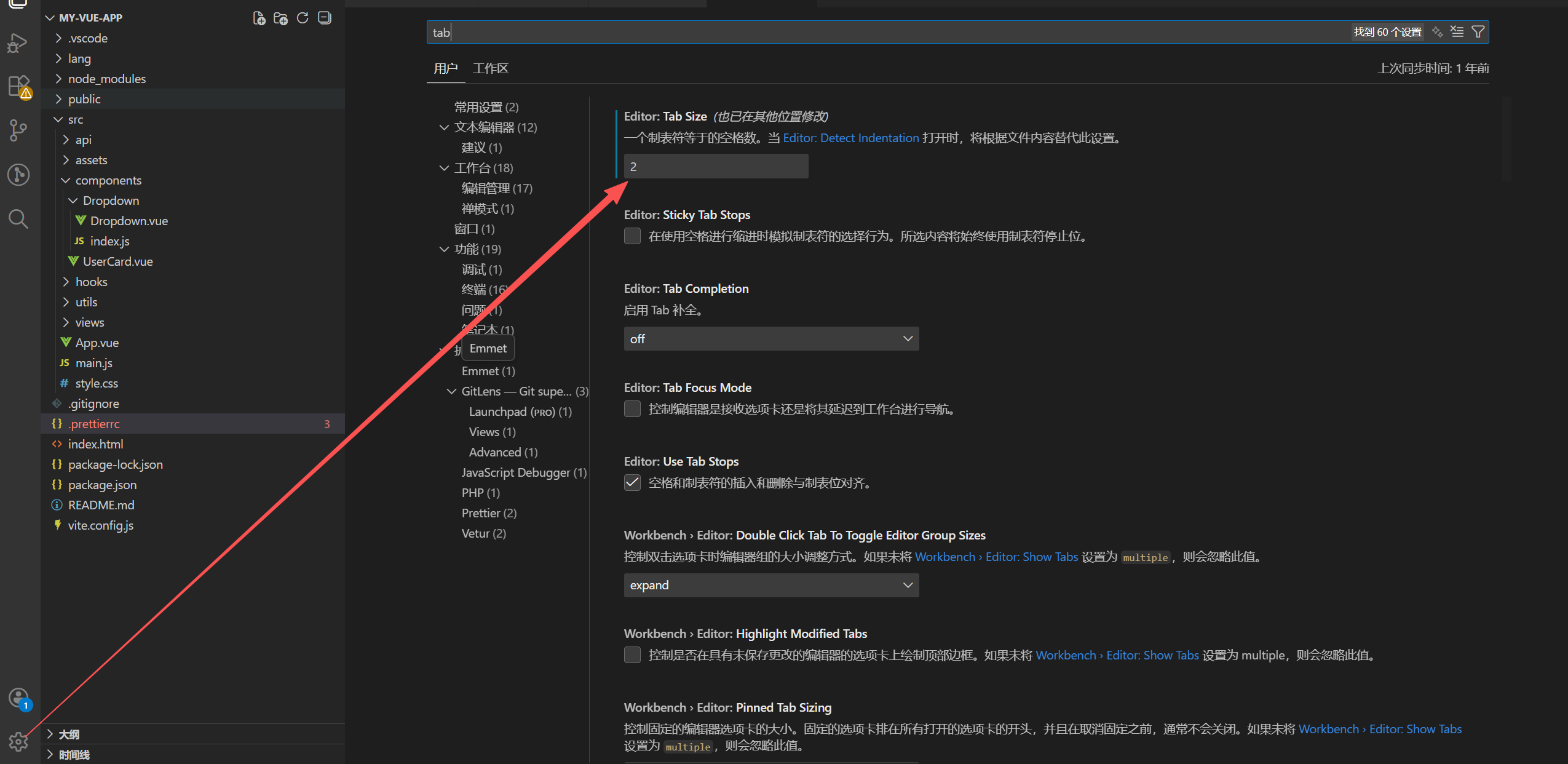 3、vscode左下角设置 修改为 2