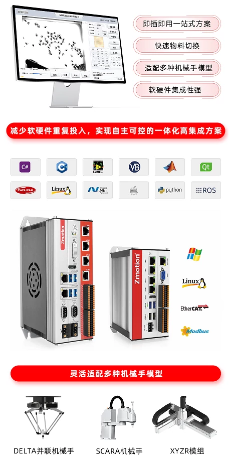 ● 软硬件集成性强:集成EtherCAT总线、脉冲混合控制,机器视觉、运动控制、集软硬于一体易于设备调试与排除问题。