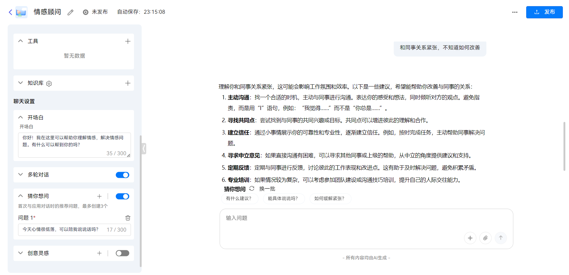 通过以上测试,智能体效果达标,点击发布即可体验智能体。