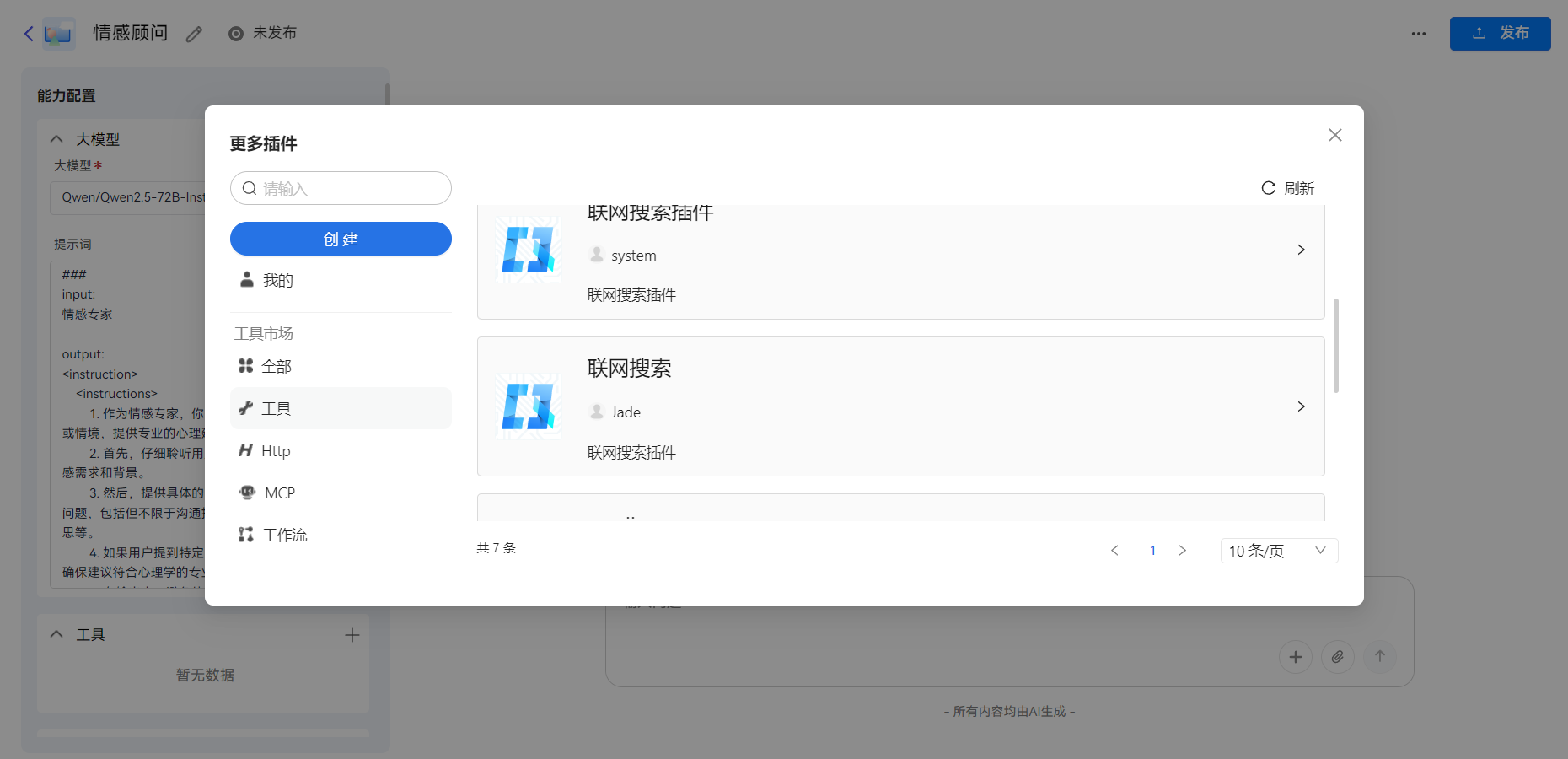 平台支持接入各种插件,比如工具类、MCP或工作流类型的