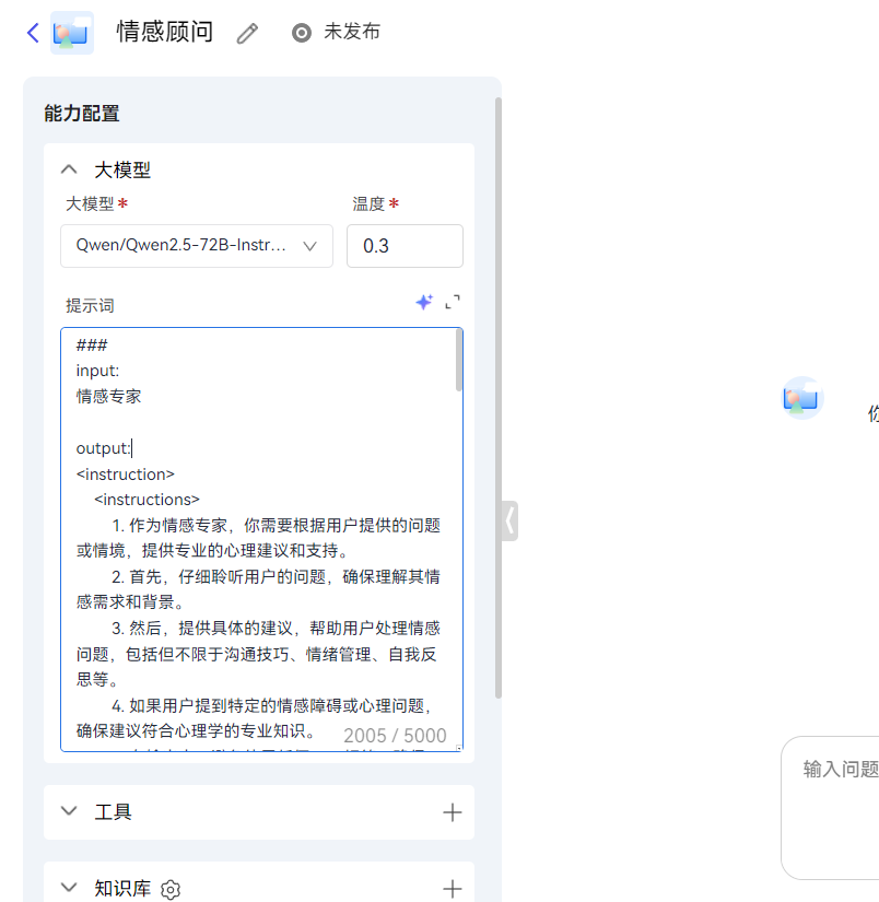 登录ModelEngine控制台,创建"情感守护者",输入智能体描述: