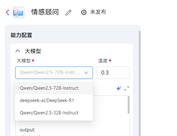 主推理模型:选择在共情理解和安全回应方面表现优秀的模型,如专门训练过心理咨询能力的大模型,这里我们选择默认的Qwen模型 。