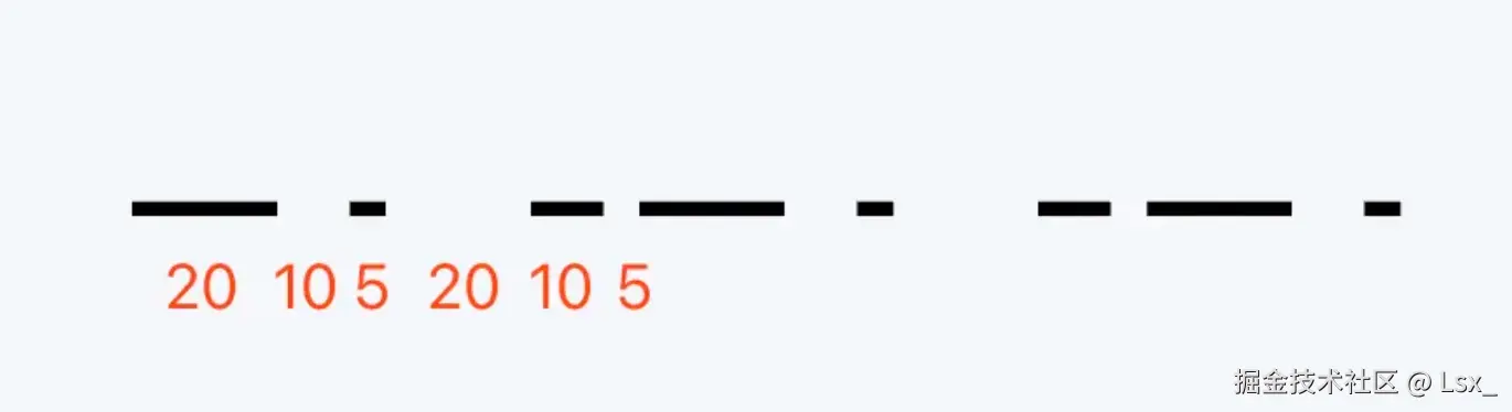 (奇数数列) stroke-dasharray="20 10 5" x1="10" y1="10" x2="190" y2="10"表示从坐标(10,10)到(200,10)这条水平线上,短划线和缺口按照20 10 5 20 10 5的顺序排列。