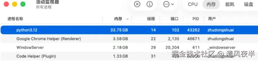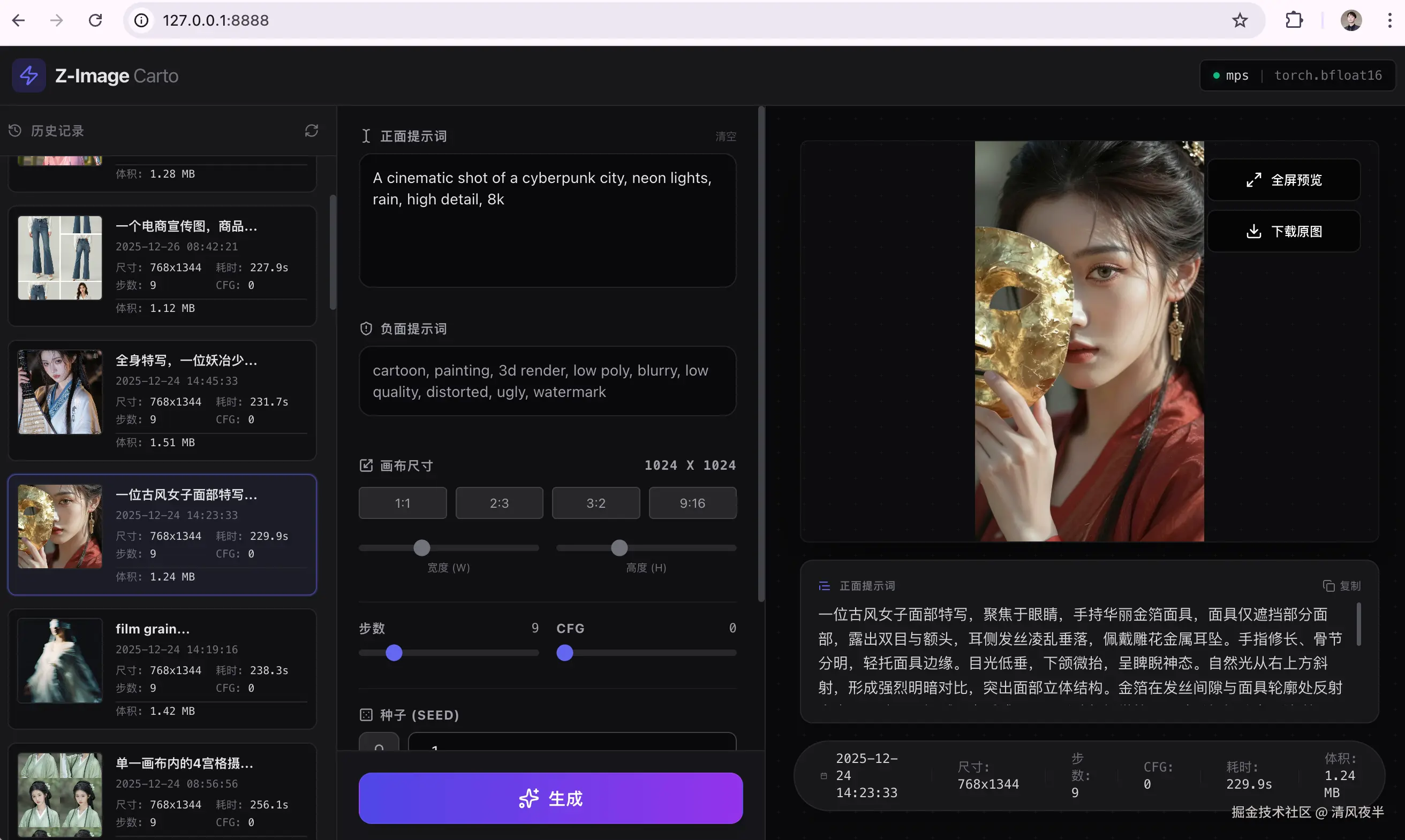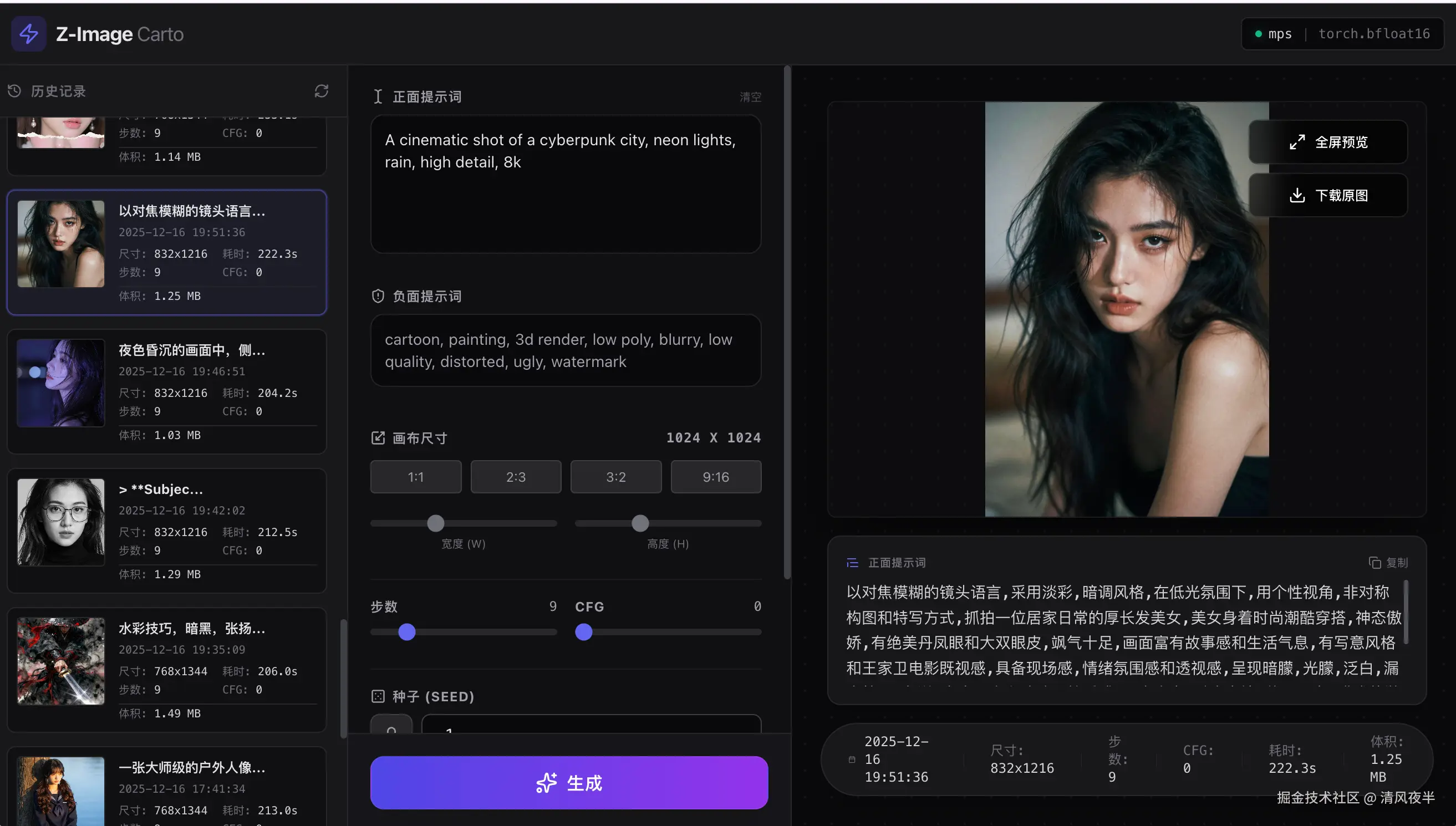 这下解决了爆内存的问题,但是内存占用还是很高,电脑又卡又发烫,生成图片的时候基本不能干其他事。 原因是Z-Image-Turbo 默认推荐使用 FP16 半精度进行推理,这在 Nvdia 显卡(cuda)上表现比较好,但在 Mac M 系列芯片(mps)上,FP16 极易爆内存,为了保证可用性,不得不使用FP32 全精度,但又会导致显存占用翻倍且推理缓慢。