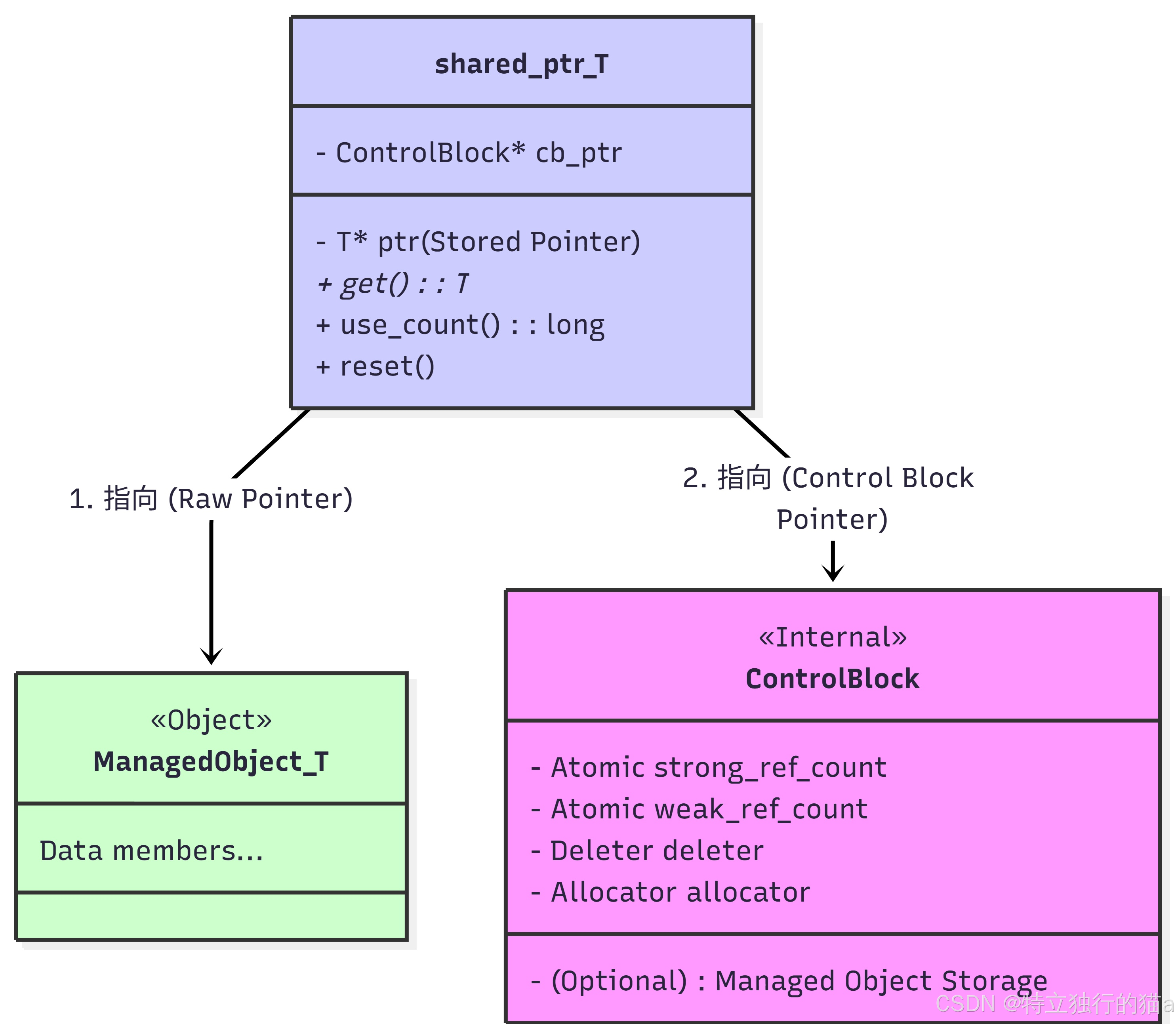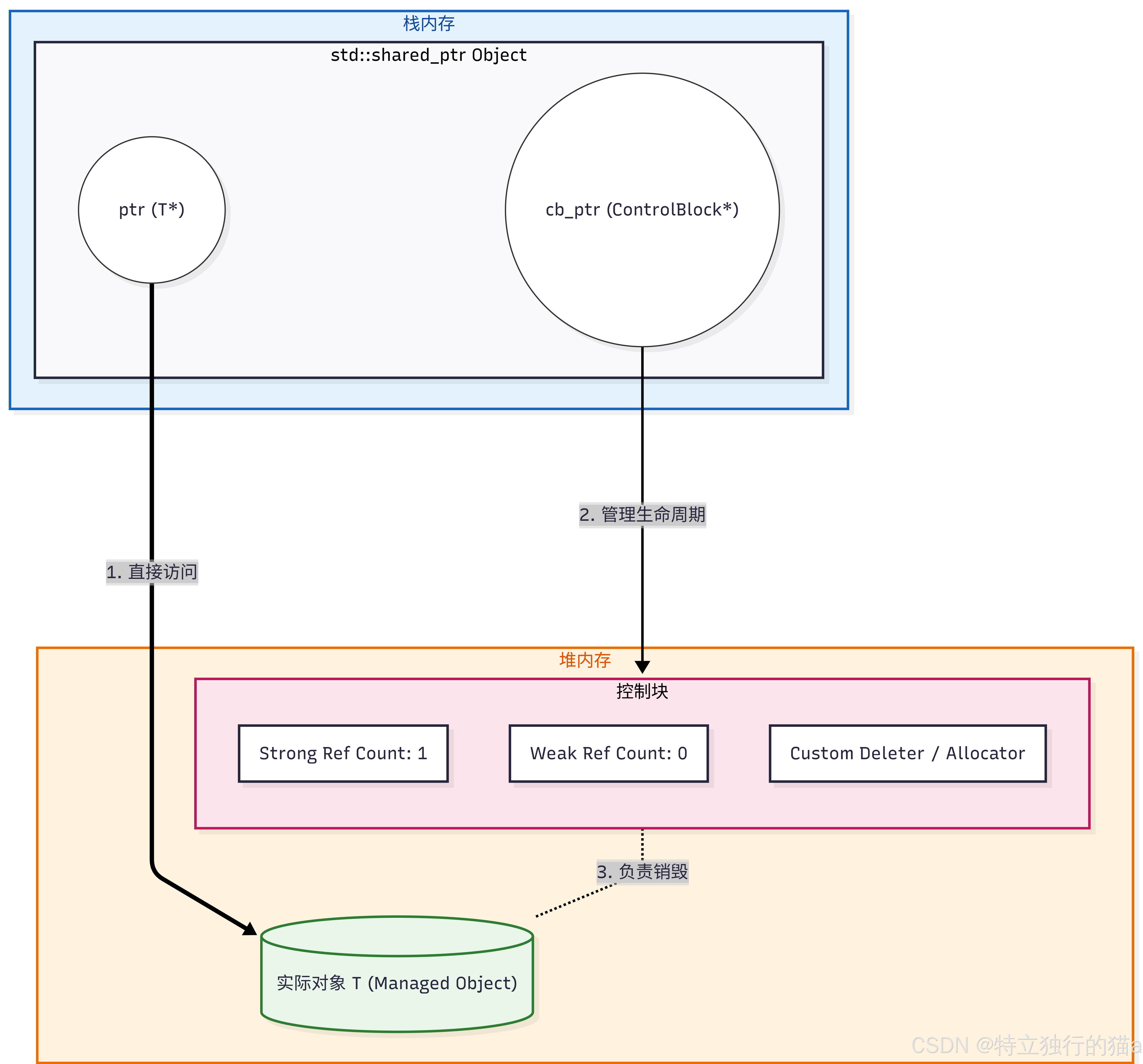 - 对象释放: 所有 shared_ptr 离开作用域,use_count 归零,对象被 delete。